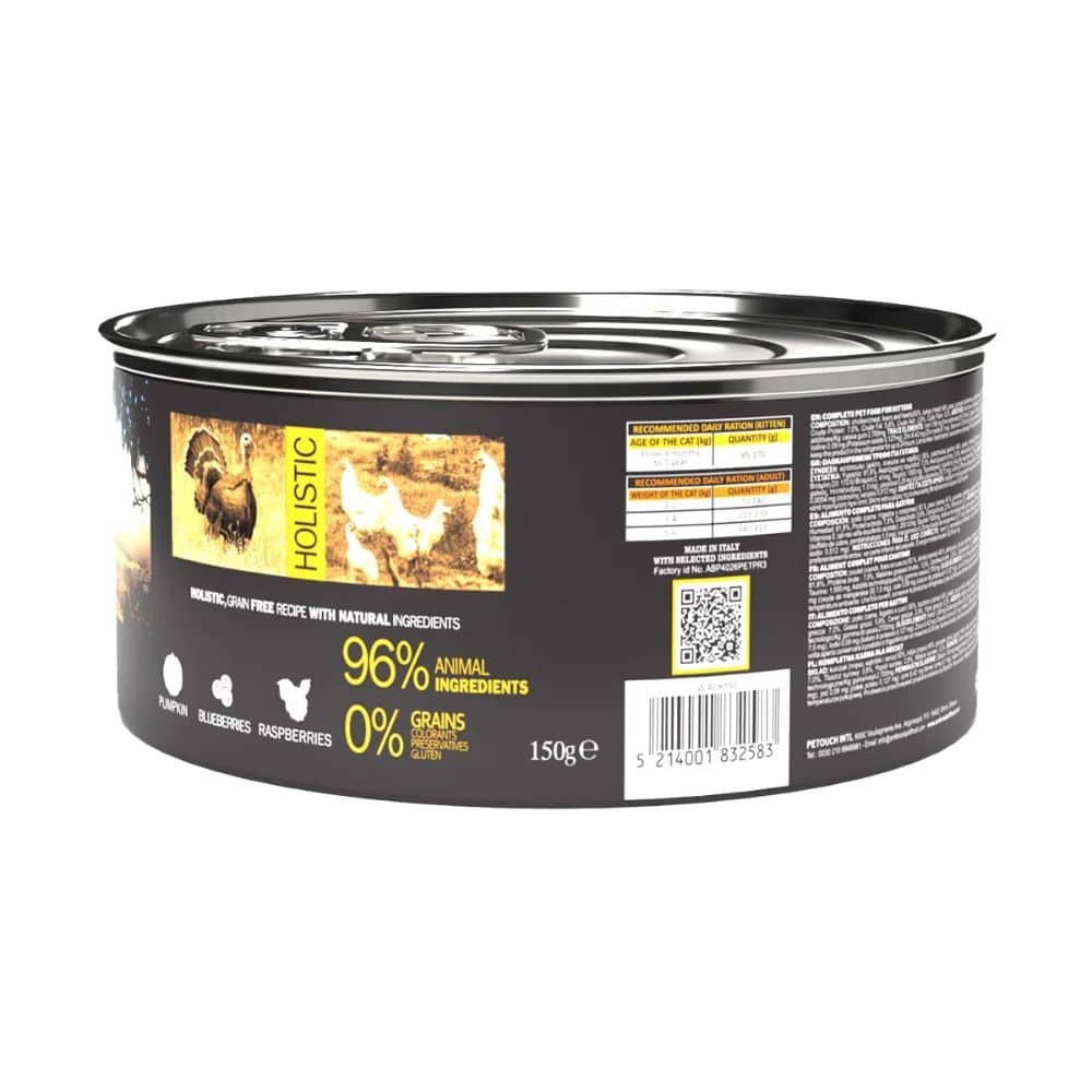 „Ambrosia Turkey & Chicken“ receptūra – tai puikus kalakutienos ir antienos mėsos derinys, užtikrinantis subalansuotą ir skanų maistą. Tinkamas kačiukams ir suaugusiems katėms, jis pasižymi idealiu drėgmės lygiu ir tekstūra, todėl jūsų augintiniui bus tikras gardus ir apetitą žadantis malonumas. Puikiai tinka kaip visavertis maistas arba kaip priedas prie jūsų katės sauso maisto. „Ambrosia Turkey & Chicken“ – tai aukščiausios kokybės be grūdų kačių maistas, užtikrinantis optimalų maitinimą katėms ir kačiukams.