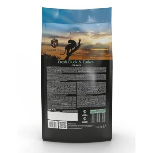 Mūsų Ambrosia Fresh Duck & Turkey receptas sujungia baltymų turtingas šviežias ančių filė su maistinėmis medžiagomis prisotinta džiovinta kalakutiena, derinama su kruopščiai pasirinktais vaisiais ir daržovėmis. Specialiai sukurtas jautrioms suaugusioms katėms, gyvenančioms viduje, šis receptas taip pat puikiai tinka sterilizuotoms ir antsvorio turinčioms katėms. Jame yra mažai riebalų, kas padeda užkirsti kelią svorio augimui, taip pat DL-methioninas ir mažas magnio kiekis, kurie padeda sumažinti struvitų akmenų susidarymo riziką.