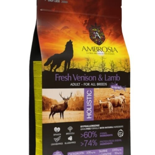 AMBROSIA Grain-Free Lamb & Fresh Venison Adult suteikia pilną ir subalansuotą mitybą suaugusiems šunims, užtikrindama, kad jie gautų aukščiausios kokybės maistą be nereikalingų užpildų. Ši aukščiausios kokybės formulė suteikia skanų ir maistingą patiekalą, kurį jūsų šuo tikrai pamils.
