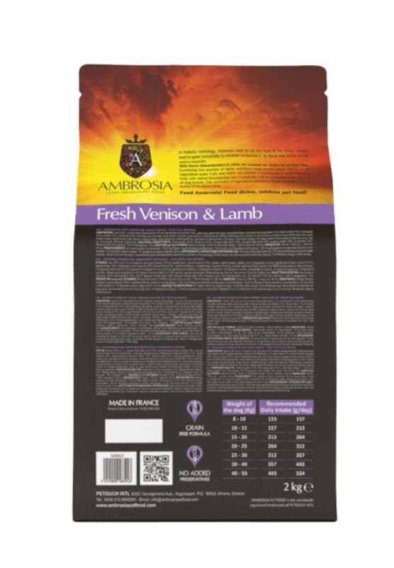 AMBROSIA Grain-Free Lamb & Fresh Venison Adult yra aukščiausios kokybės sausas maistas suaugusiems šunims. Ši formulė yra ideali šunims, turintiems jautrumą grūdams arba tiems, kurie reikalauja riboto ingredientų kiekio dietos. Aviena ir šviežia elniena užtikrina lengvai virškinamus aukštos kokybės baltymus, todėl ši dieta yra puikus pasirinkimas šunims, turintiems alergiją arba maisto jautrumą.
