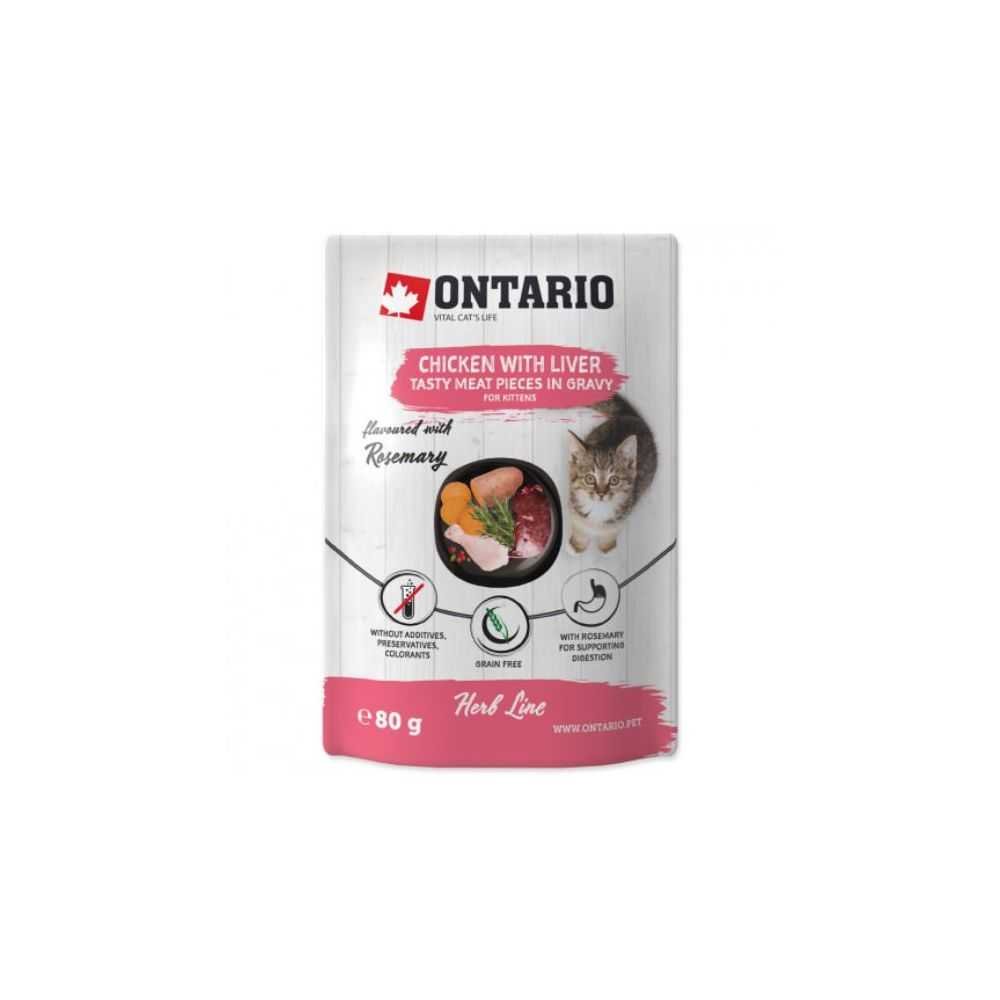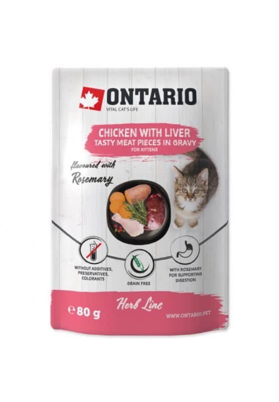 Ontario Herb Kitten – konservai kačiukams – vištienos gabaliukai su kepenėlėmis ir saldžiosios bulvės skaniame padaže. Specialiai pagardintas rozmarinu.