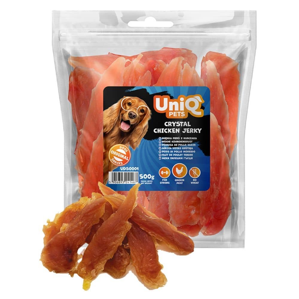 UNIQ PETS Crystal Chicken Jerky, 500 g – tai aukščiausios kokybės minkšta vištienos filė, sukurta šunų skoniui ir sveikatai. Pagaminta iš tikros vištienos, ši jerky tipo mėsa yra ne tik gardi, bet ir puikiai tinka kaip baltymų turintis skanėstas visų veislių ir amžiaus šunims.